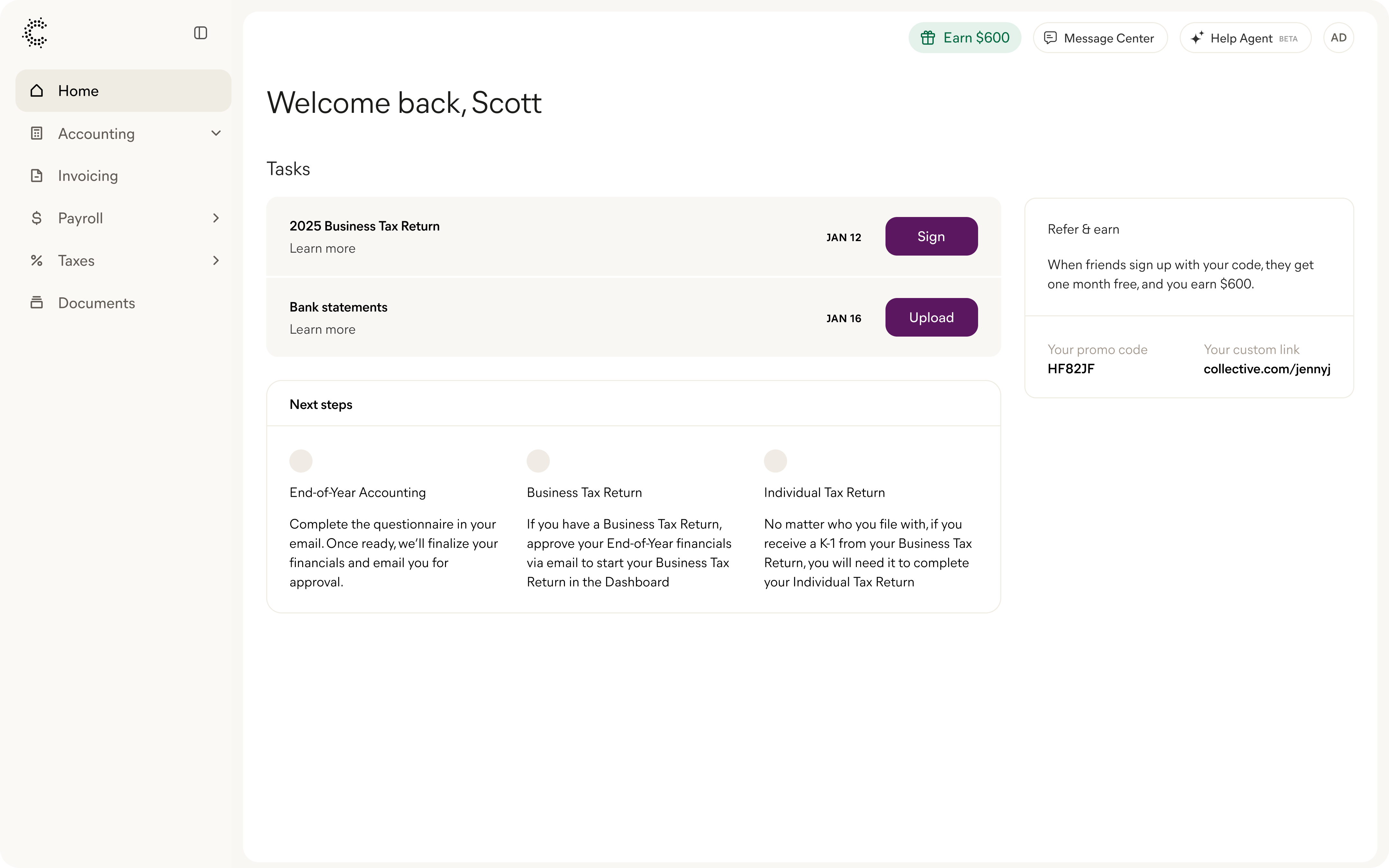 We'll help you handle business formation, taxes, bookkeeping, payroll and more from one login